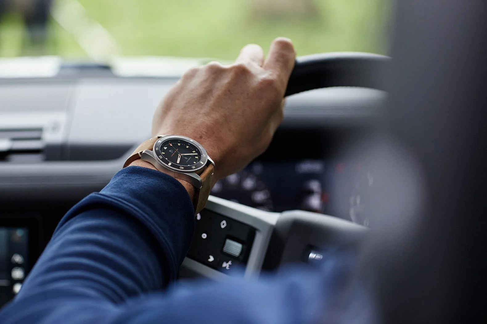 Close up of a man's hand on the steering wheel of a Landrover Defender.
