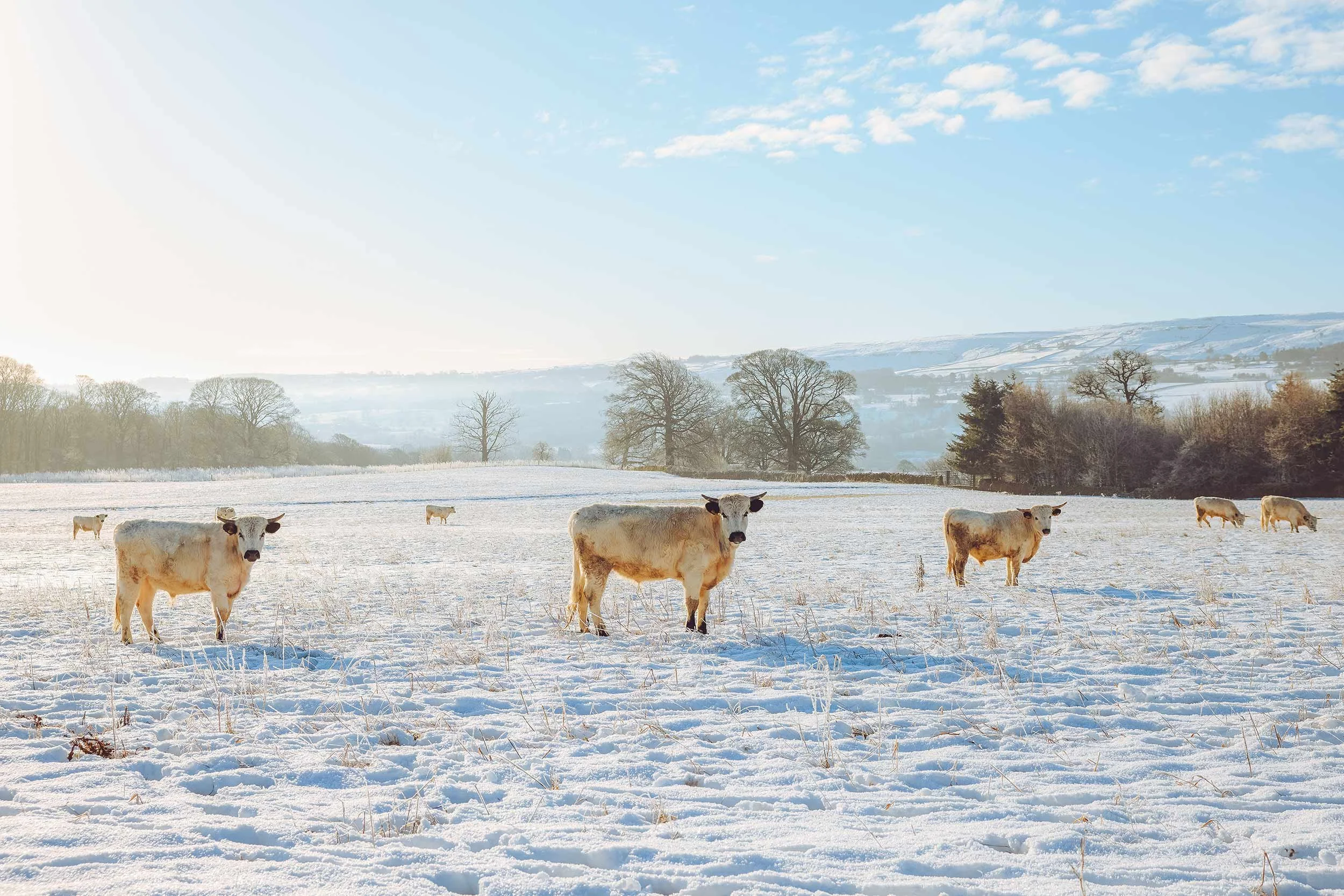 Cows standing in a snowy field with a clear blue sky and trees in the background.