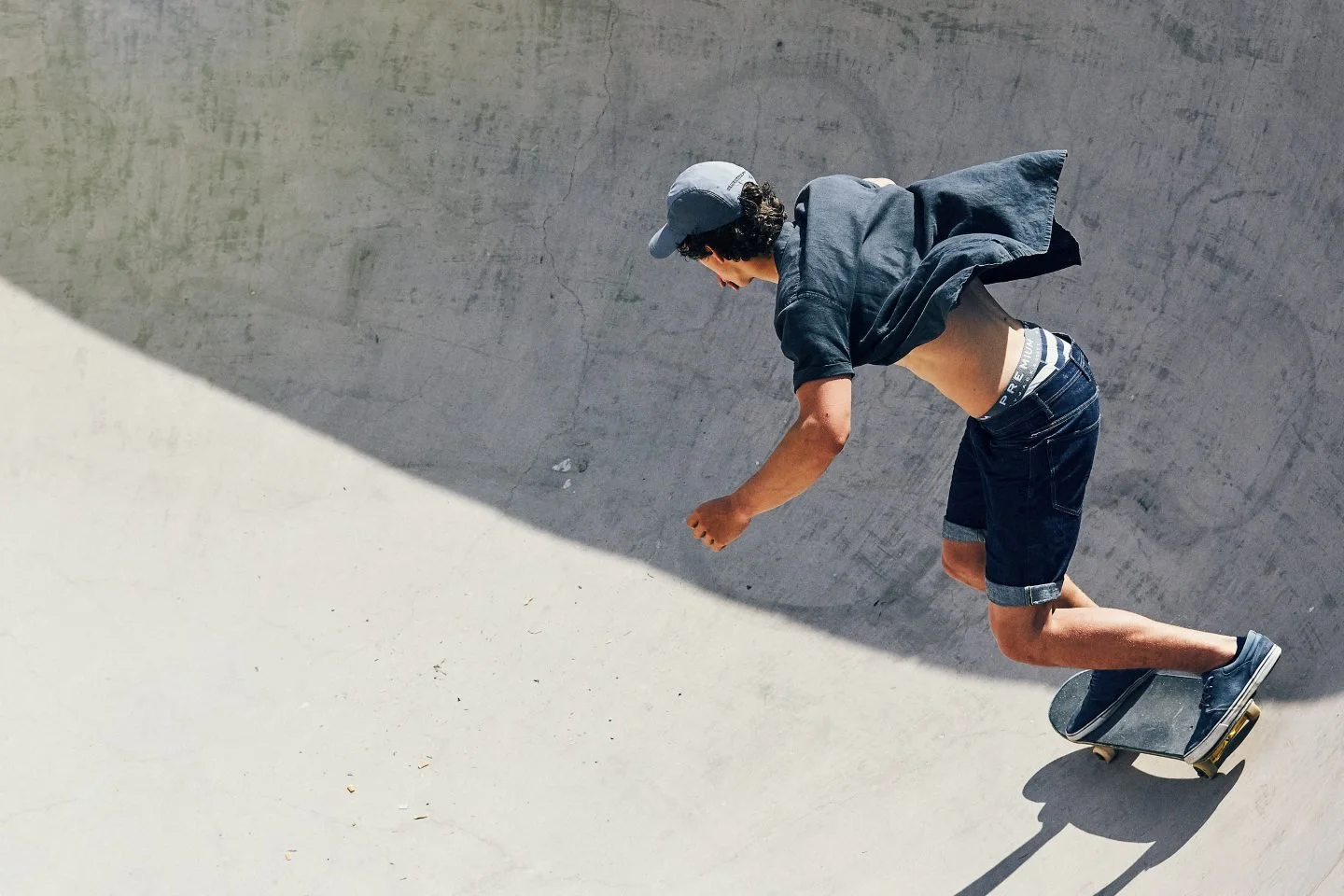 Skateboarder in mid-motion inside a skate park bowl wearing a cap, navy shirt, and rolled-up shorts.