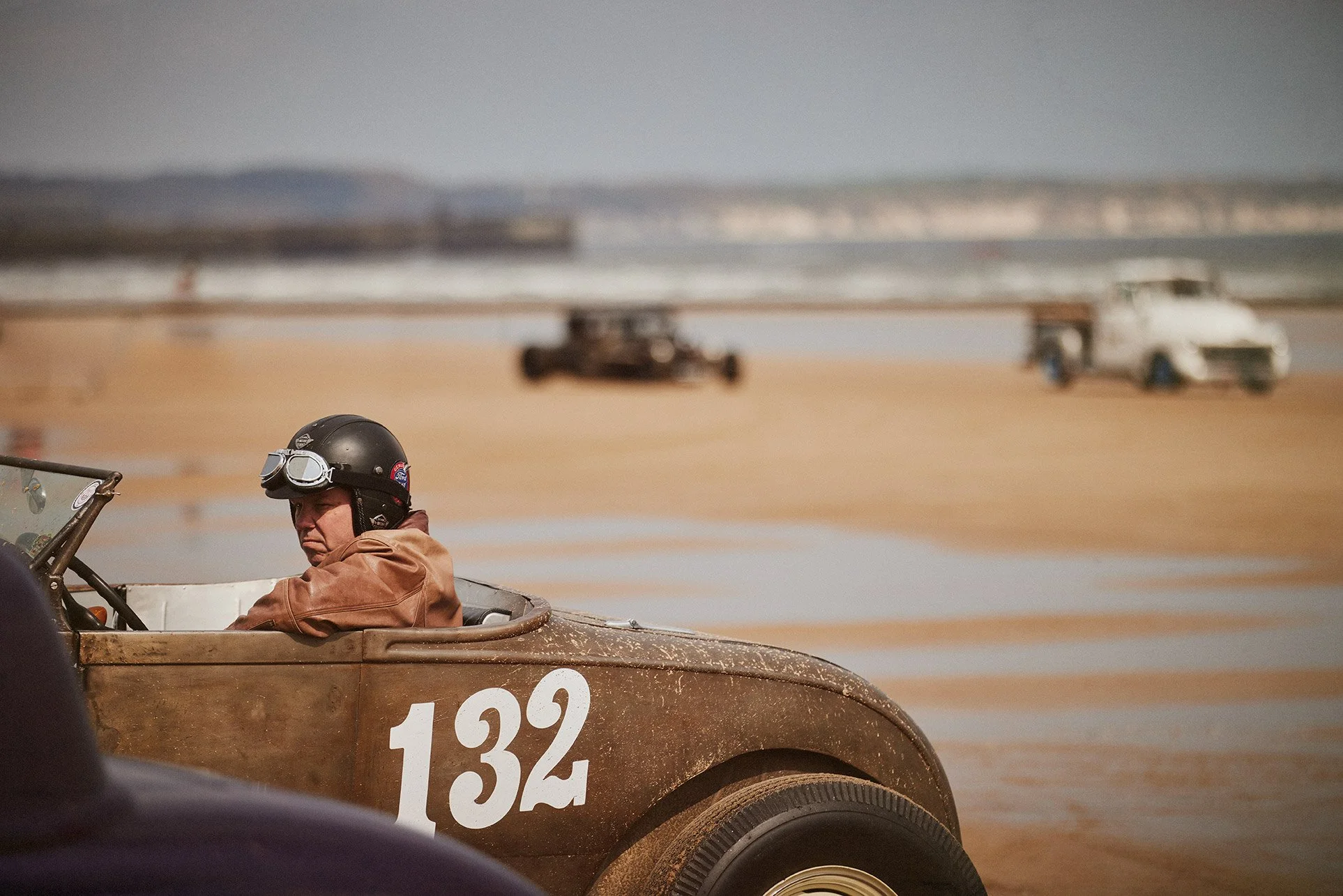 Vintage vehicles race along the beach in Bridlington, East Yorkshire.