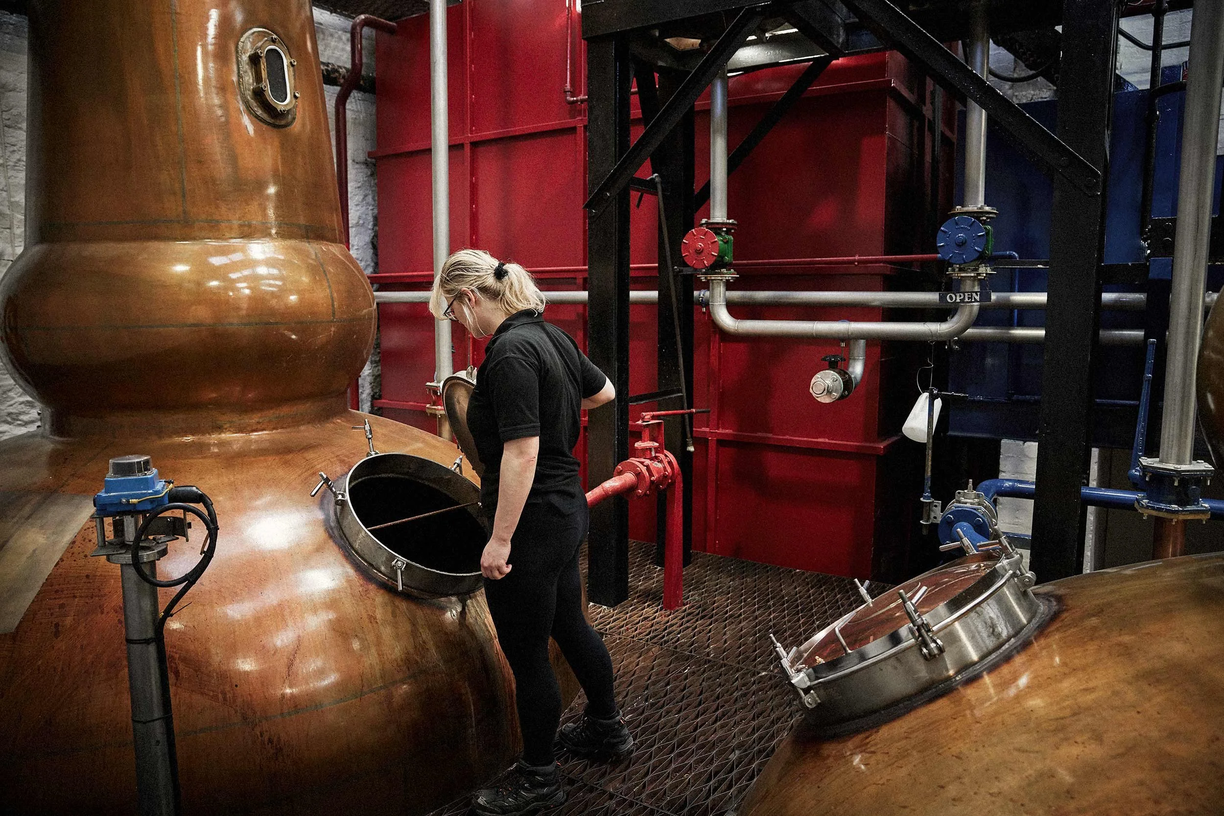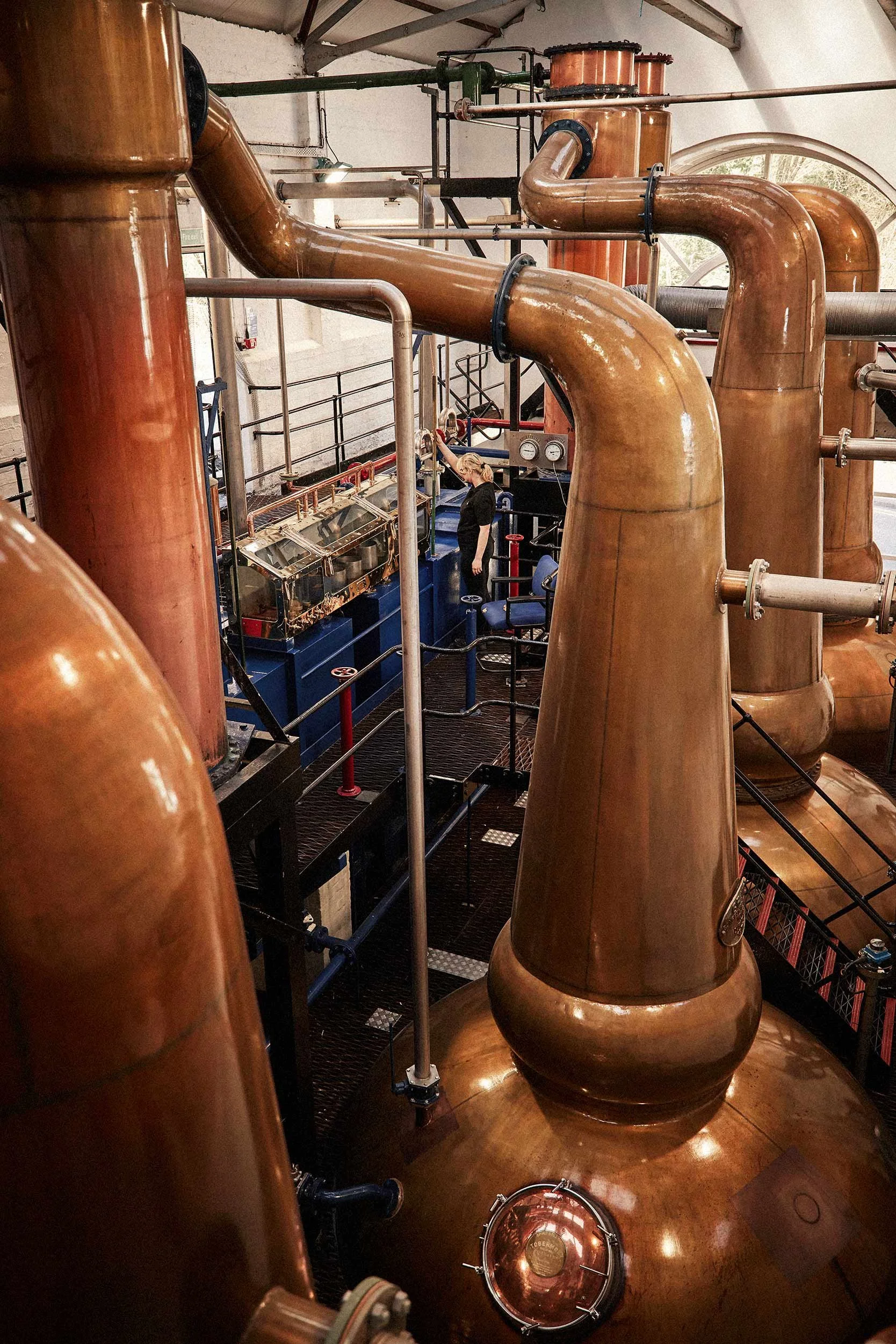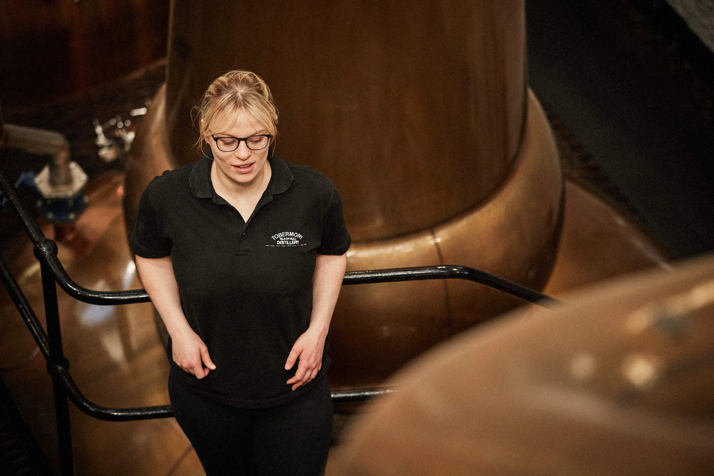 Tobermory distillery lifestyle imagery of a female employee checking on one of the four large copper stills. View fullsize