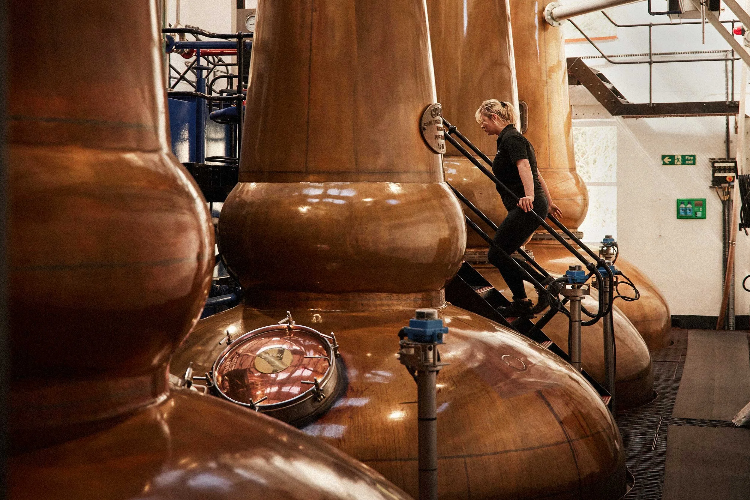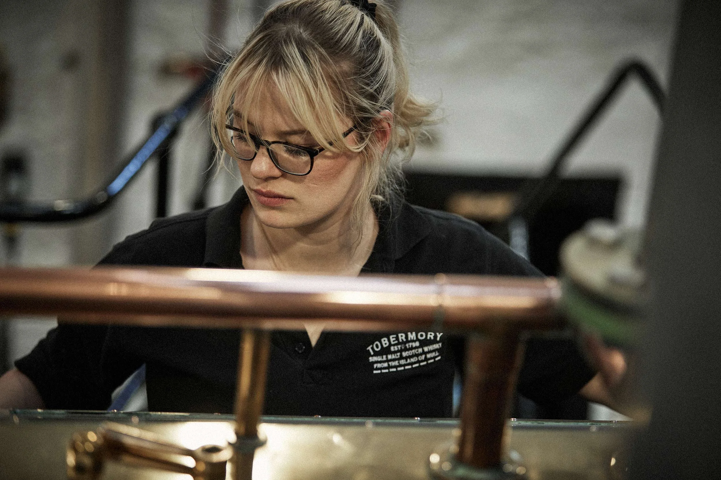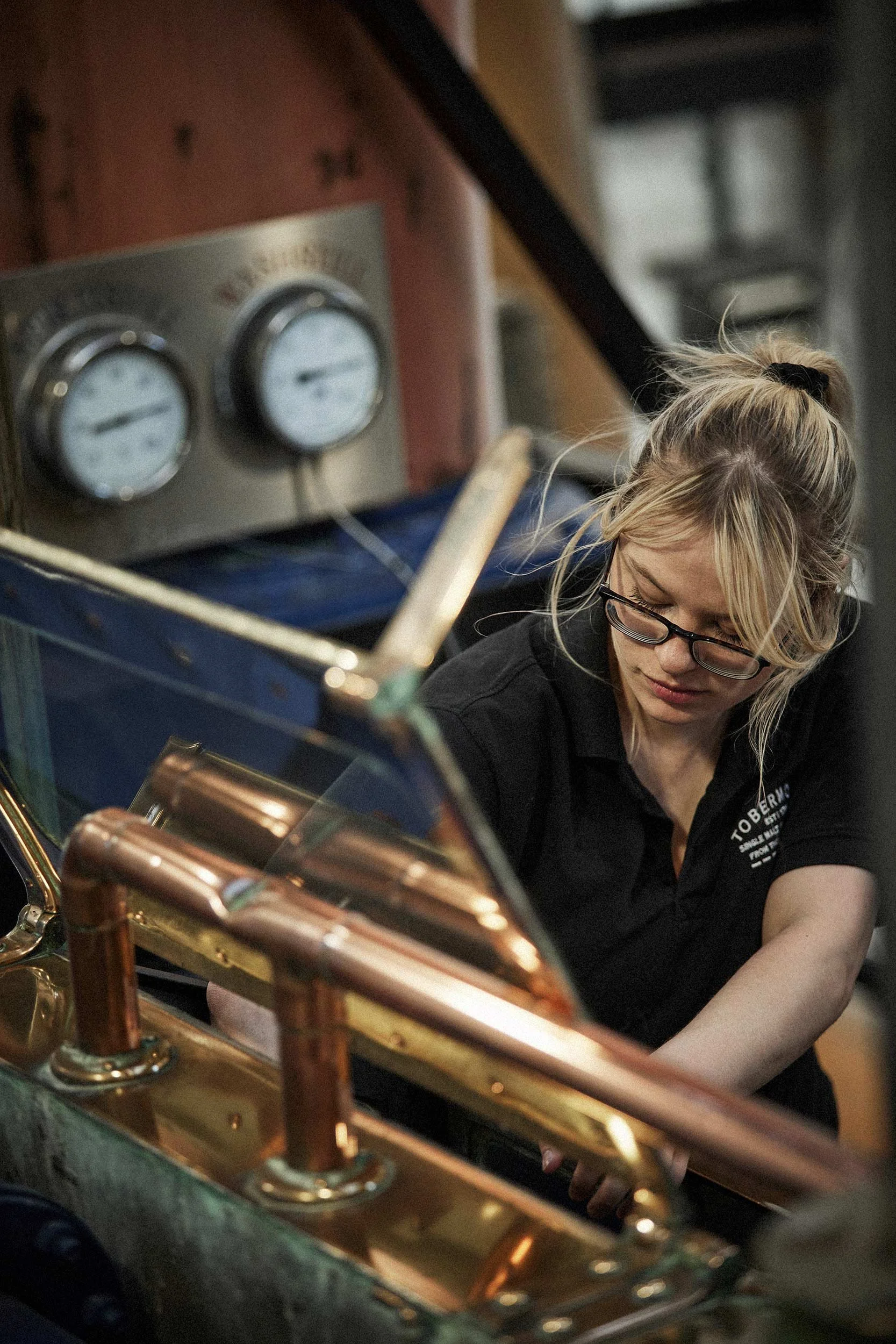 Tobermory distillery lifestyle imagery of a female employee checking on one of the four large copper stills. View fullsize