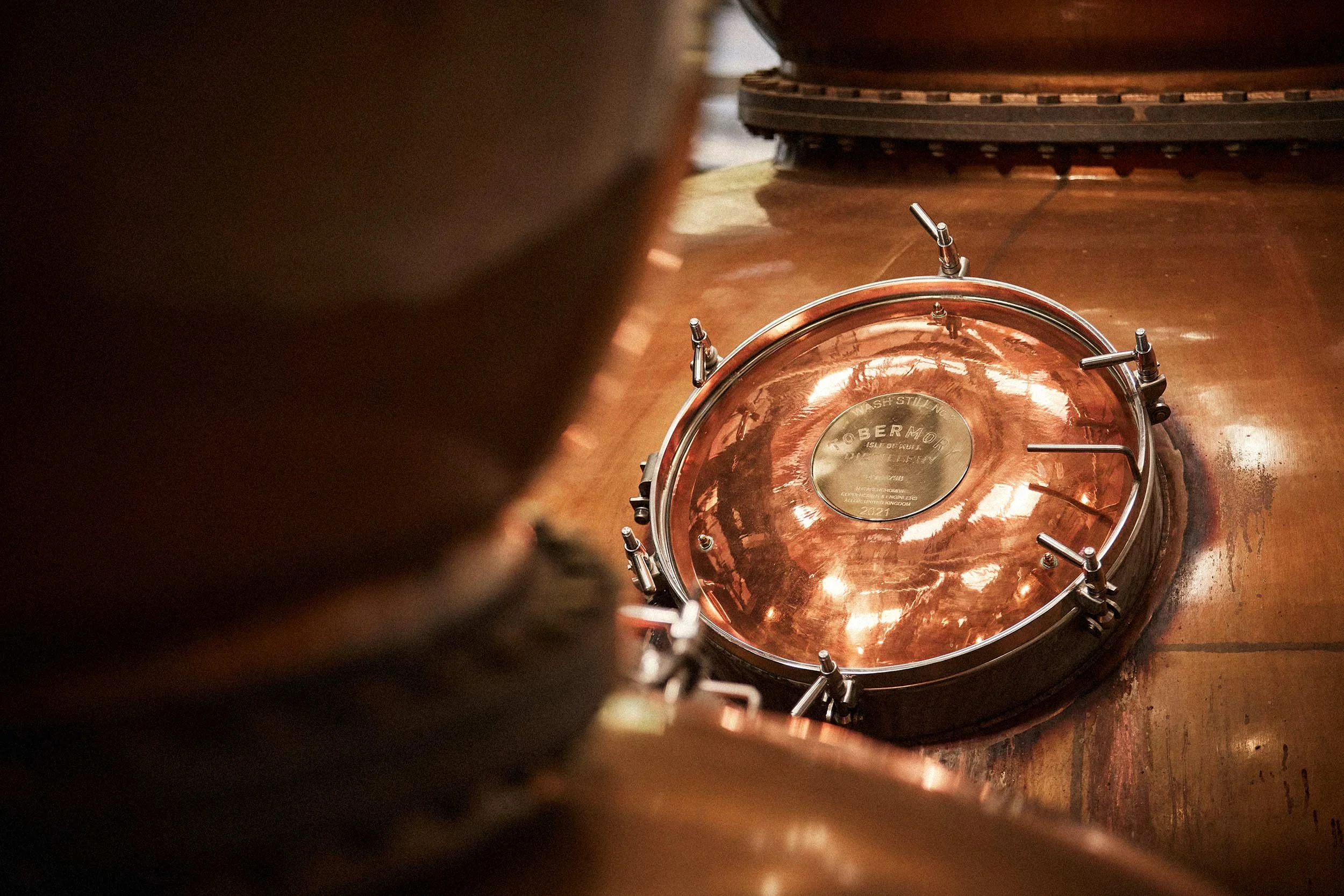 Tobermory distillery lifestyle imagery of a female employee checking on one of the four large copper stills.