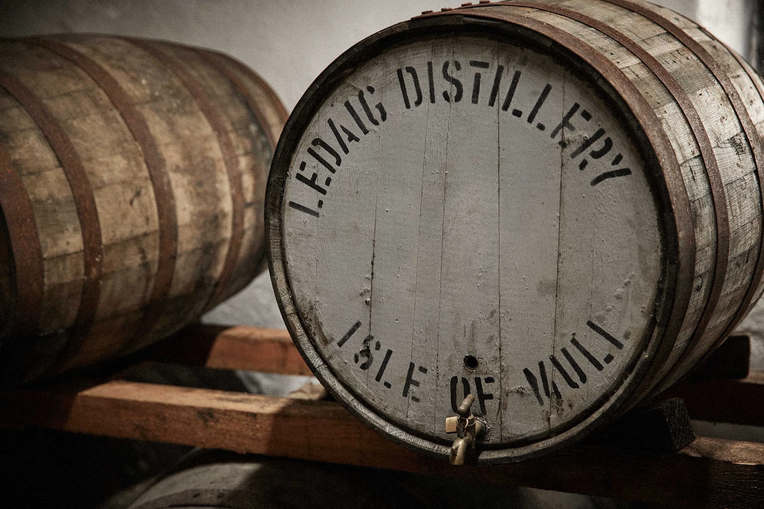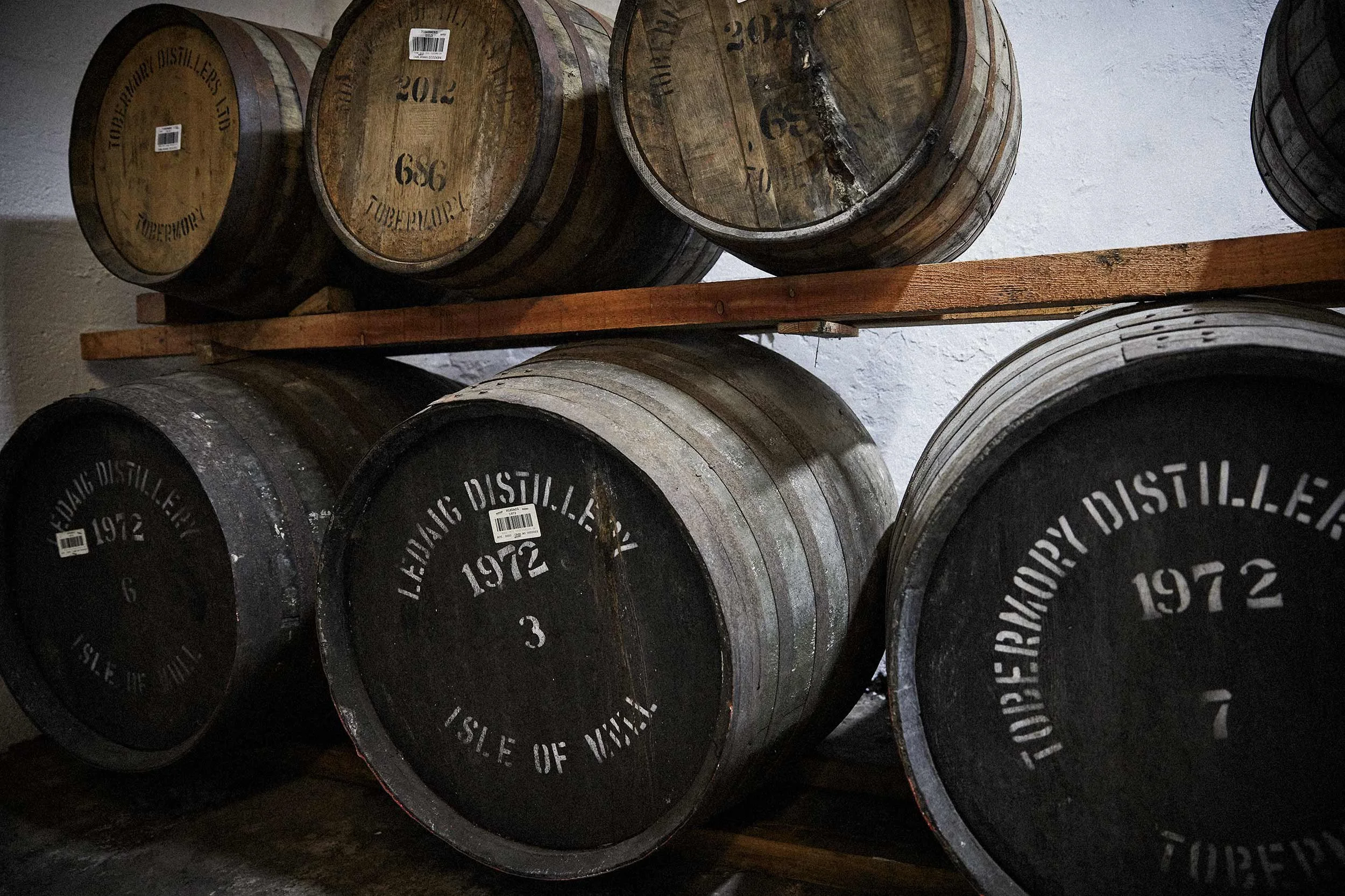 Oak barrels for the storage of whisky at the Tobermory Distillery on the Isle of Mull.